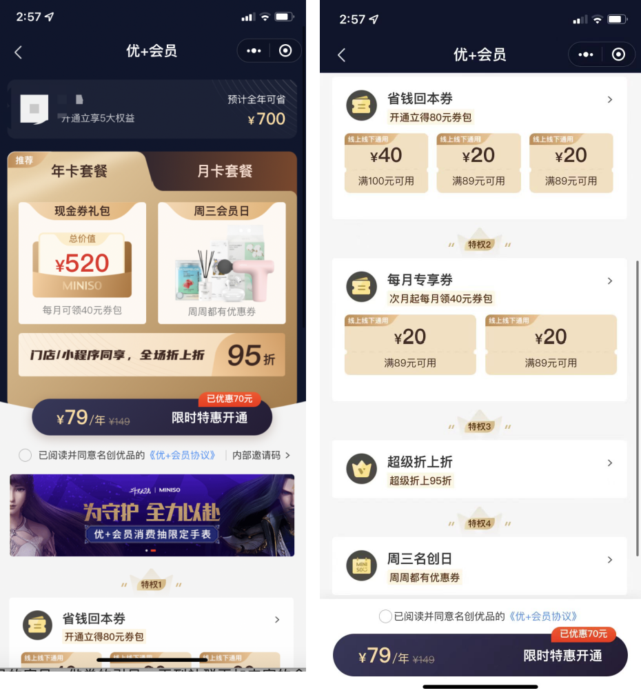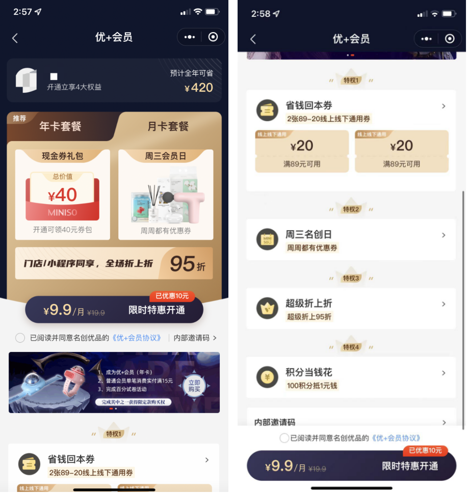 付費會員:名創(chuàng)優(yōu)品設置了兩檔付費會員,79元/年的年卡和9.9元/月的月卡。對于經(jīng)常購買的用戶來說,是十分劃算的。具體權益如下: