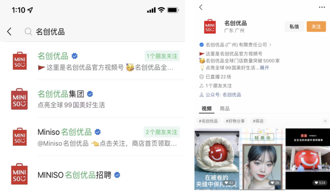 視頻號:名創(chuàng)優(yōu)品旗下有4個視頻號,分別承擔著賣貨直播、招聘信息、集團品宣等不同內容職責。以主號「名創(chuàng)優(yōu)品」為例,主頁中有公眾號的入口,主要的視頻內容以品牌宣傳、產(chǎn)品種草為主。