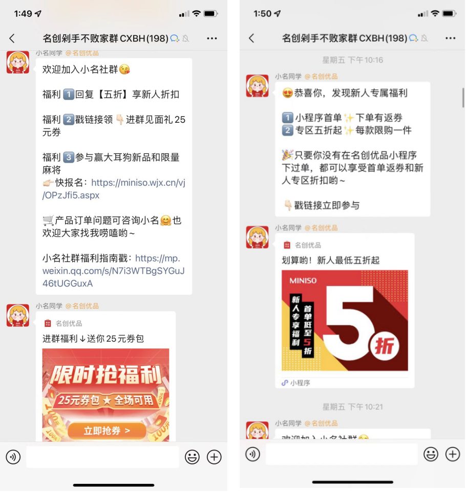 昵稱:小名同學(取了名創(chuàng)優(yōu)品的“名”字,讓用戶有記憶點) 頭像:名創(chuàng)優(yōu)品獨有的卡通形象 自動歡迎語:第一時間發(fā)送社群鏈接,并告知社群里包含的福利,讓用戶及時掌握所有的價值信息。 朋友圈內容:主要內容為福利活動、產(chǎn)品種草等。