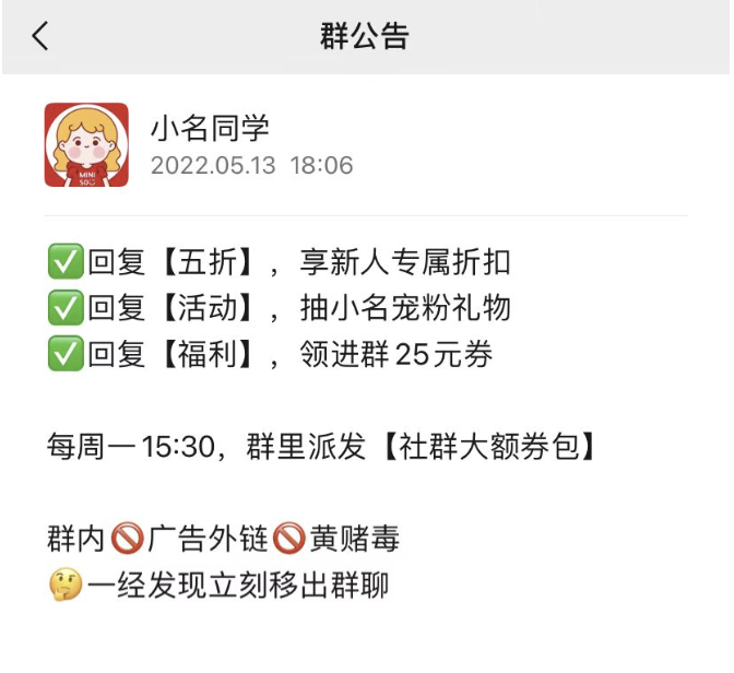 群公告會告知福利的內容和領取方式,也會將發(fā)布相應的群規(guī),讓用戶了解到相關群規(guī)范,知道這個群是有人管理的,用戶歸屬性更強。