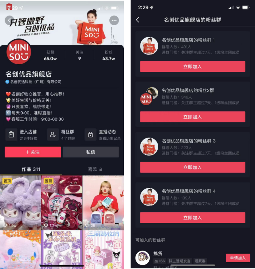 在抖音上名創(chuàng)優(yōu)品會通過視頻內容和直播引導用戶進行下單,此外用戶還可進入粉絲群,在群里進行引導復購。