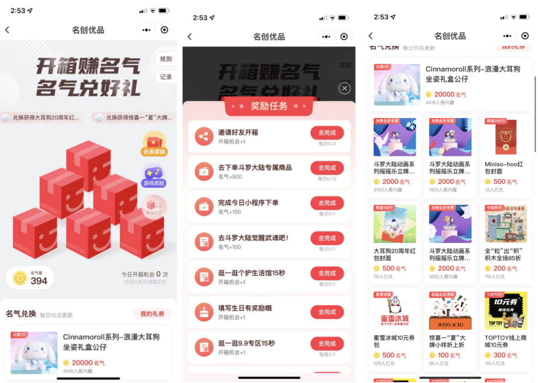 名氣積分:可以理解為另一種積分模式。通過邀請、簽到、下單、任務換取名氣積分,名氣積分可以兌換公仔、商品優(yōu)惠券、臺歷等眾多商品。