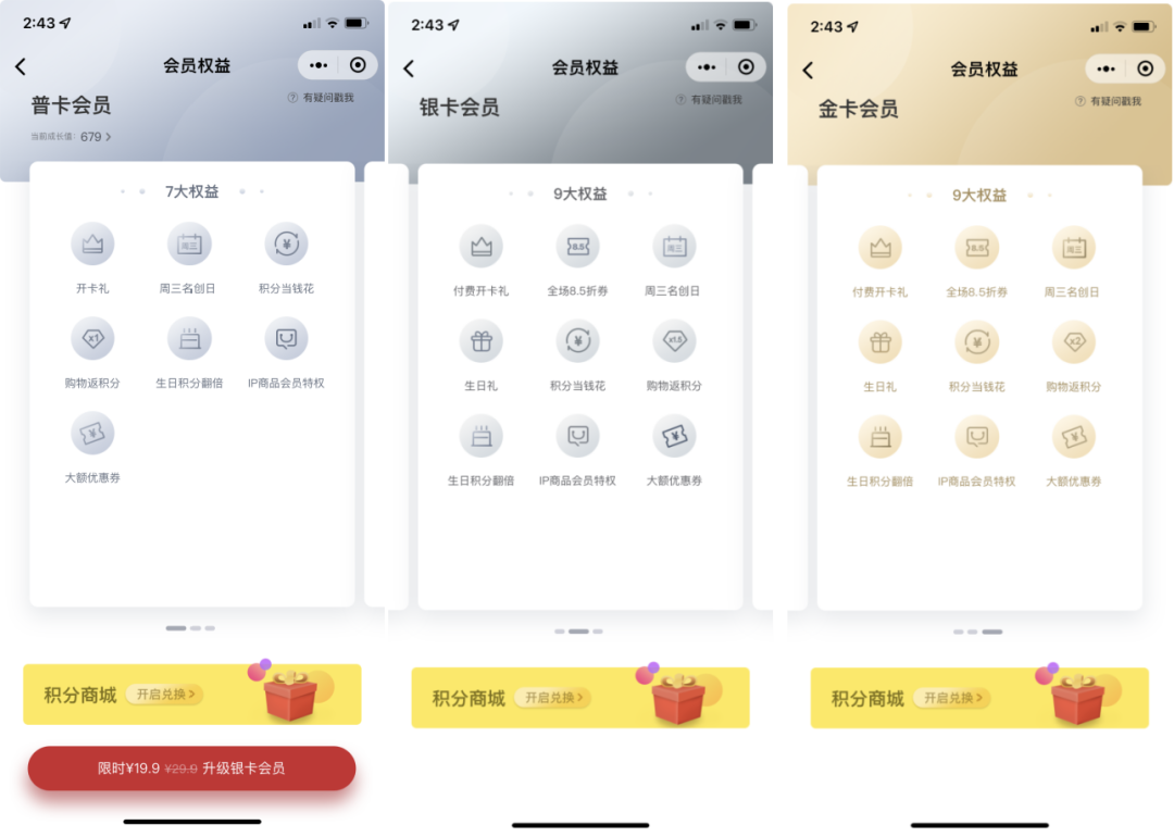 銀卡會員:3000-5999個成長值,普卡用戶可以直接花費19.9元升級