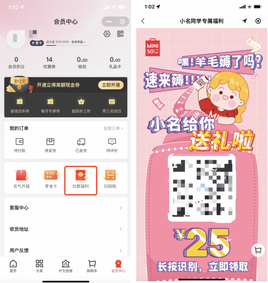 小程序:名創(chuàng)優(yōu)品的小程序除了線上購買的功能,還承載了重要的私域引流入口。具體路徑: