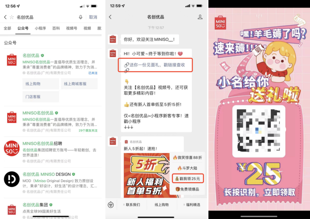 公眾號:名創(chuàng)優(yōu)品旗下有眾多官方公眾號,其中主號「名創(chuàng)優(yōu)品」粉絲數(shù)量更是超過3200萬,在關注公眾號后就會推送私域添加入口,具體路徑: