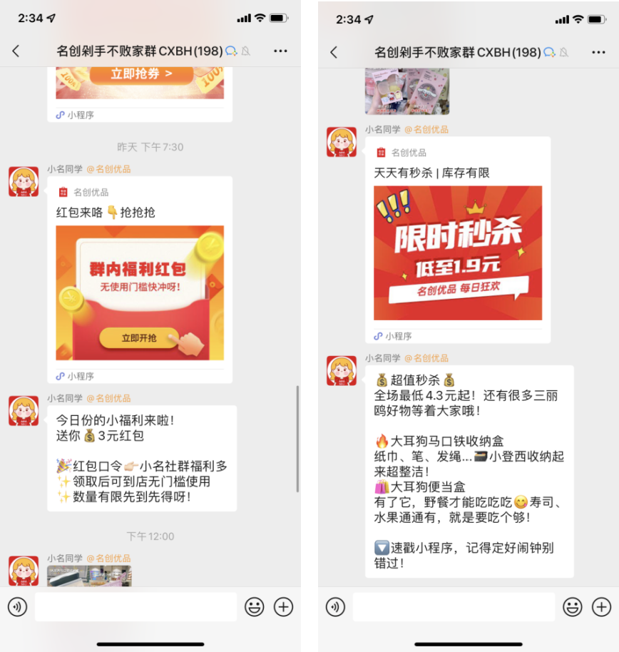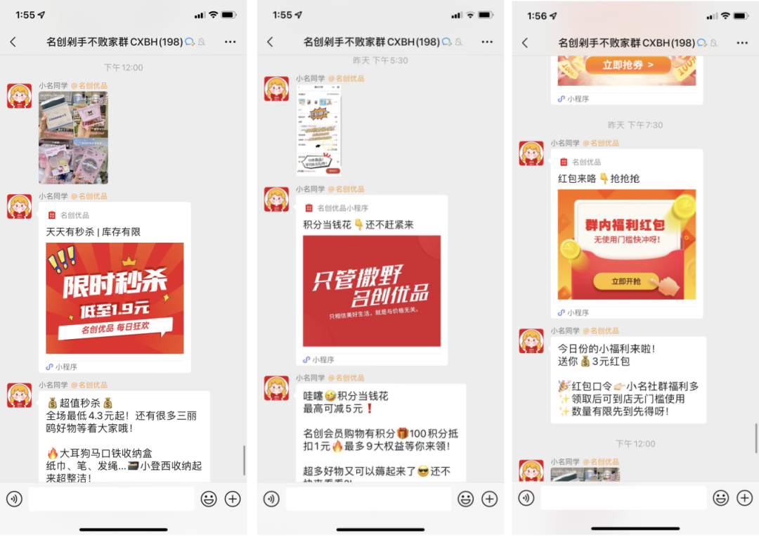 名創(chuàng)優(yōu)品的社群內容主要以產(chǎn)品推薦、福利發(fā)放為主。以我添加的社群為例: