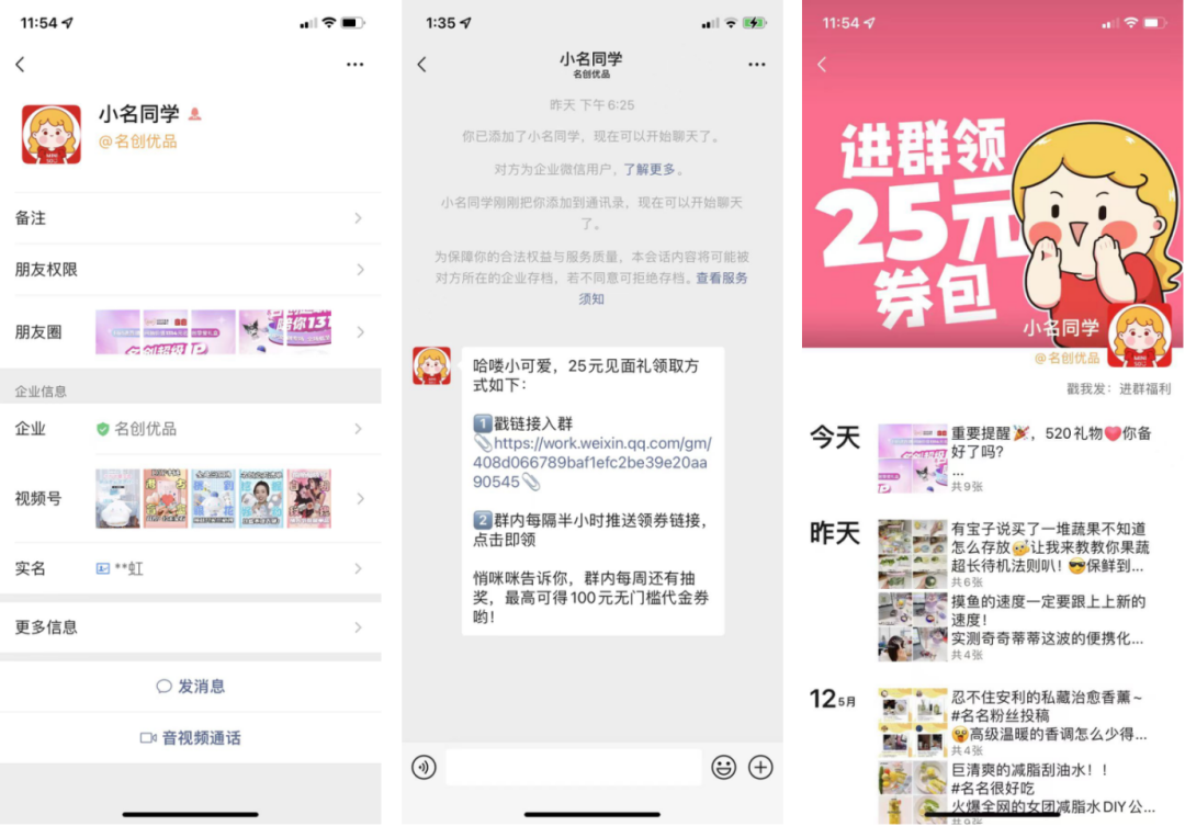 私域作為名創(chuàng)優(yōu)品的重要渠道,其員工運營的企業(yè)微信也十分重要,員工的一舉一動都代表著名創(chuàng)優(yōu)品的對外形象。以我添加的某個員工微信為例: