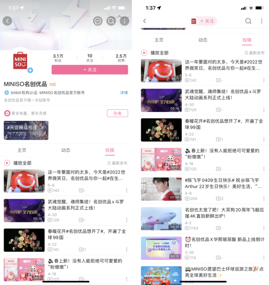 b站:目前粉絲數(shù)3.1萬,主要內容為品牌宣傳、產(chǎn)品種草為主。