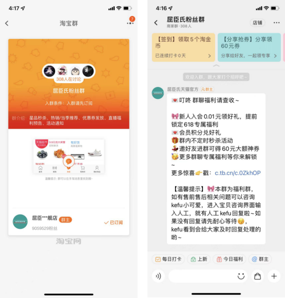 值得一提的是,淘寶內(nèi)對社群的運營十分重視,進群即送福利,通過直播更好地引導用戶下單購買。