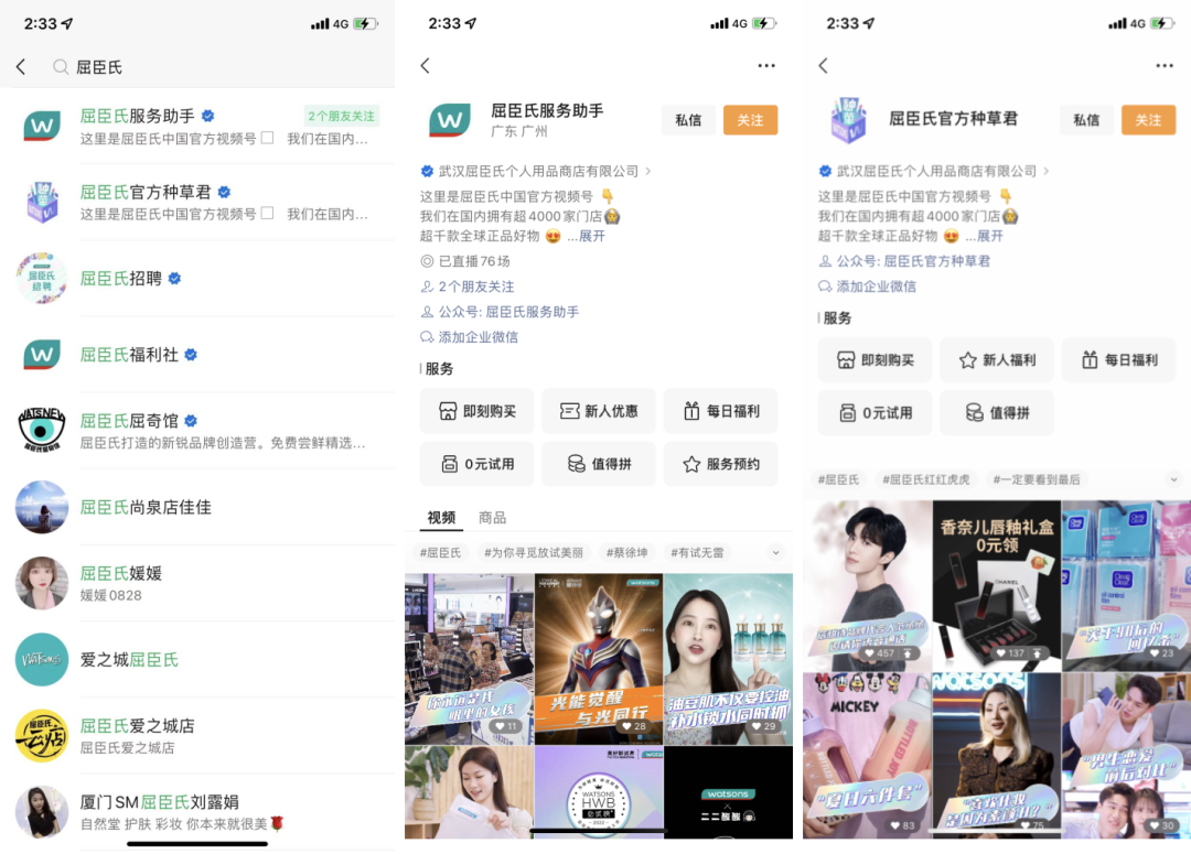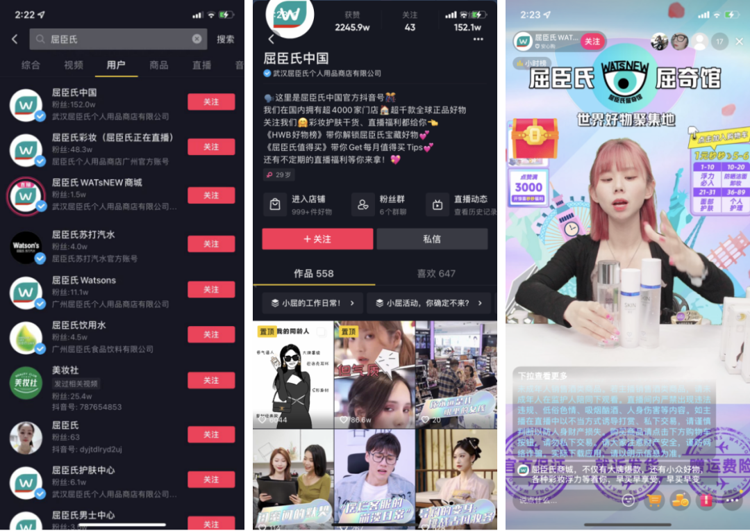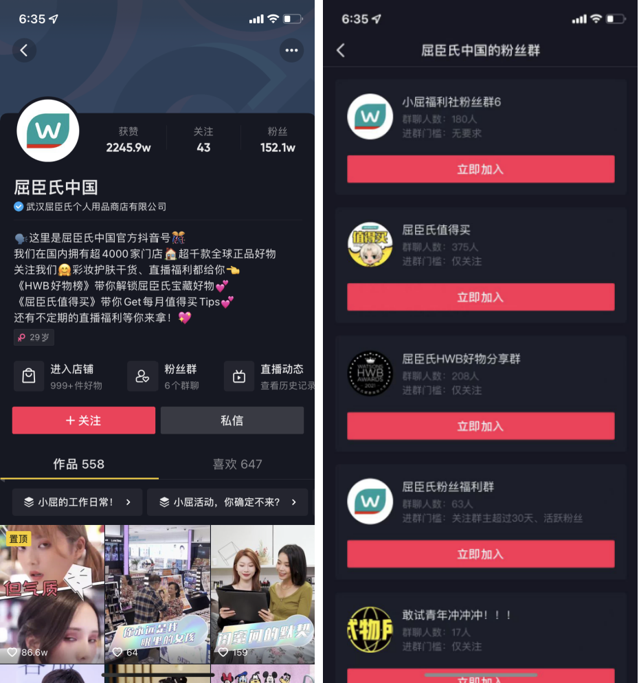 在抖音上屈臣氏會通過視頻內(nèi)容和直播引導用戶進行下單,此外用戶還可進入粉絲群,在群里進行引導復購。
