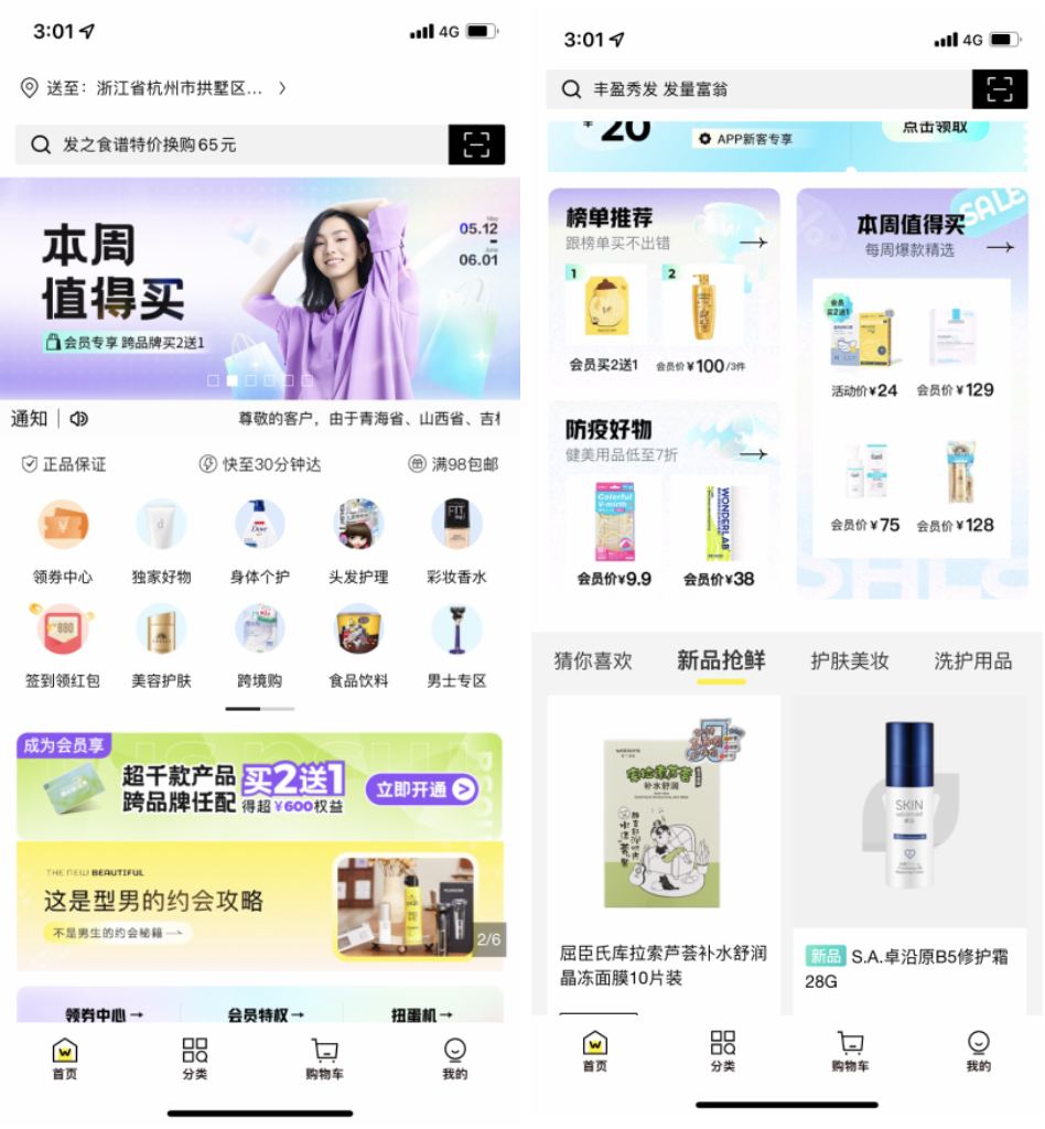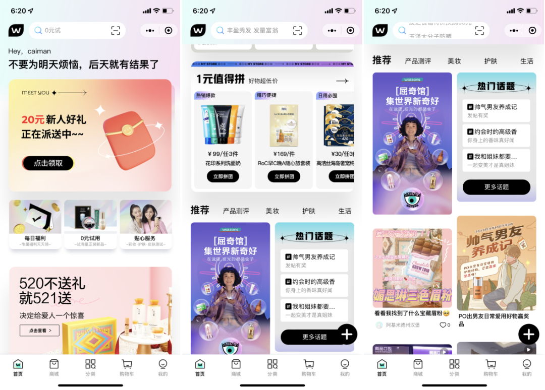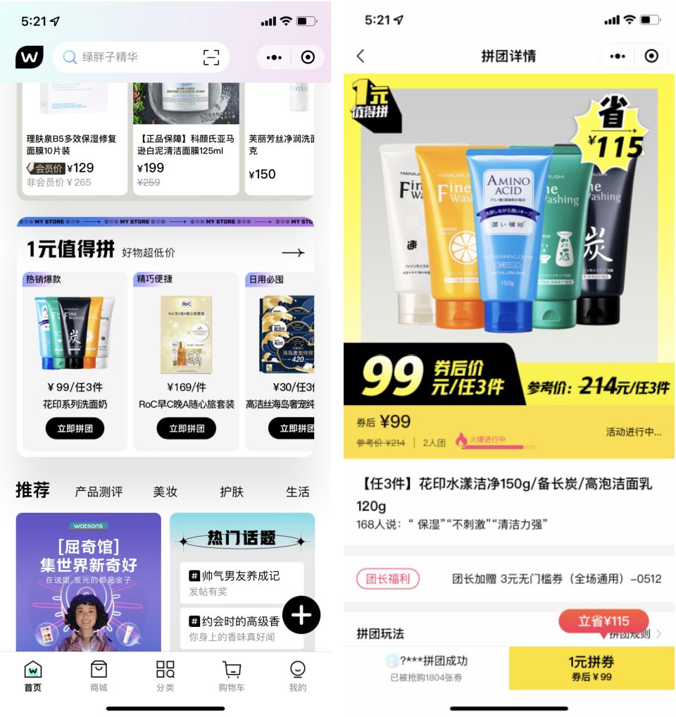在屈臣氏的小程序主頁里,放置了新人專區(qū)、拼團專區(qū)、推薦專區(qū)等窗口,吸引不同需求的用戶下單購買。