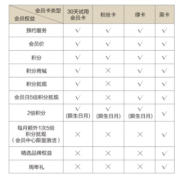會員卡類型總共分為4種:30天試用會員卡、粉絲卡、綠卡、黑卡,具體權益如下圖。