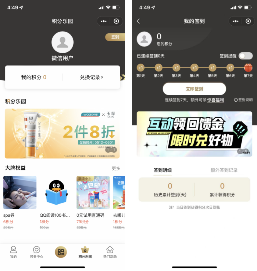 主要通過消費獲取積分,不同會員等級獲取的積分比例不同,還可以通過簽到的方式獲取積分,積分可用于抵現(xiàn)、抽獎、兌換優(yōu)惠券。