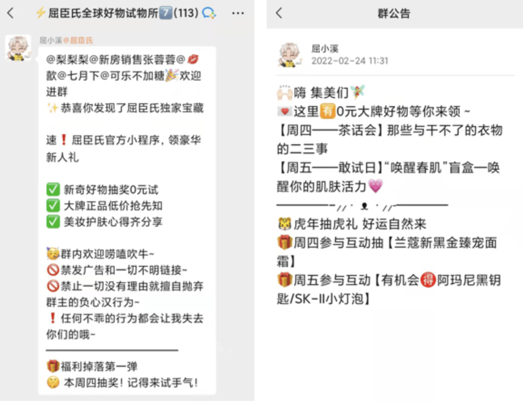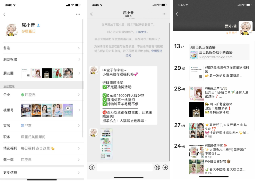 頭像:屈晨曦的卡通形象 自動歡迎語:第一時間發(fā)送社群二維碼,并告知社群里包含的福利,讓用戶及時掌握所有的價值信息。 朋友圈內(nèi)容:主要內(nèi)容為福利活動、產(chǎn)品種草等。