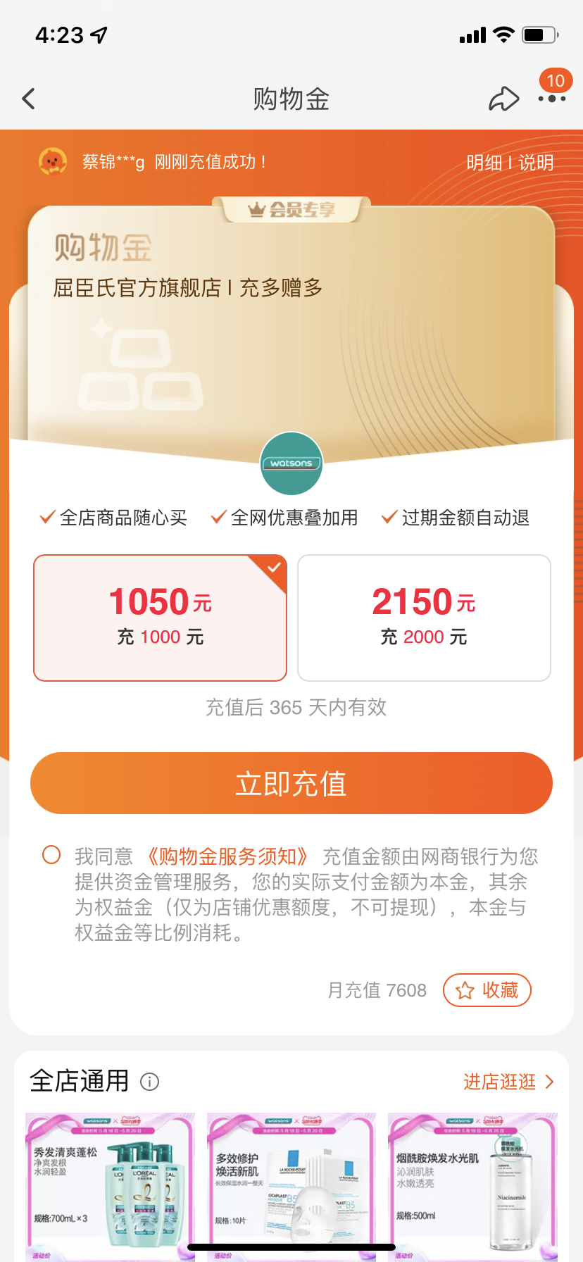 儲值卡:淘寶內(nèi)可以充值購物金,充值1000得1050,充值2000得2150。從金額來說,力度并不大,但對屈臣氏的鐵粉用戶來說,還是可以能省則省的。