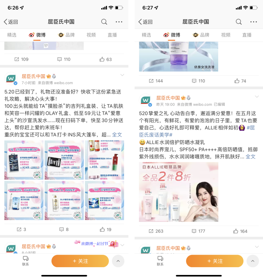 在微博上屈臣氏會通過各種活動介紹、產(chǎn)品介紹引導用戶下單,尤其是520這樣特殊的日子,發(fā)送頻率特別頻繁。