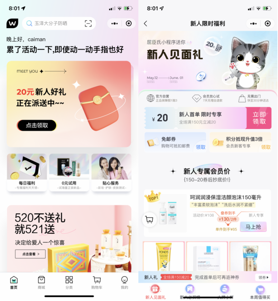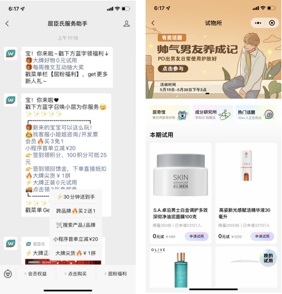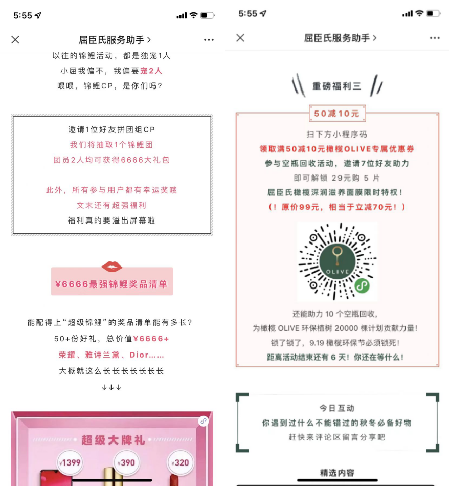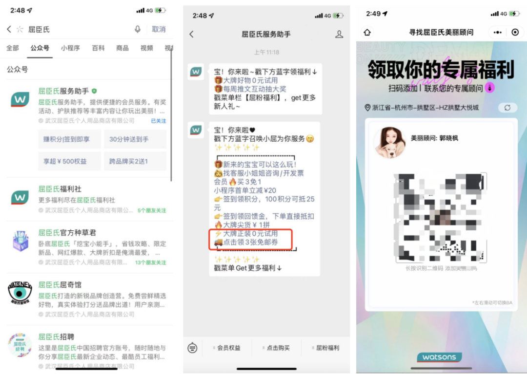 在擁有龐大私域流量的基礎之下,屈臣氏會進行一些簡單的裂變玩法,合理利用私域資源,實現(xiàn)拉新復購的效果。以公眾號裂變和小程序裂變兩種方式為例: