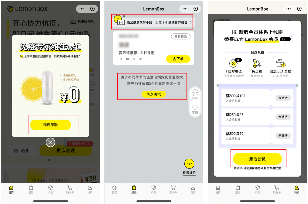 售后,用戶也可以在小程序上再次做健康測評,用來評估產(chǎn)品使用前和使用后的效果對比;同時,品牌也會給到拉新激勵,例如分享可得 30 元優(yōu)惠券,以老帶新;成為會員后,還有專屬權(quán)益激勵,周期性產(chǎn)品使用后,引導(dǎo)復(fù)購。