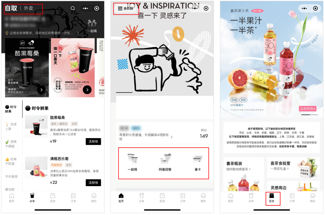 除此之外,小程序上還有「喜茶百貨」,推出新品飲料,或者周邊產(chǎn)品,例如爆款氣泡水「喜小茶」、靈感吸管杯等。