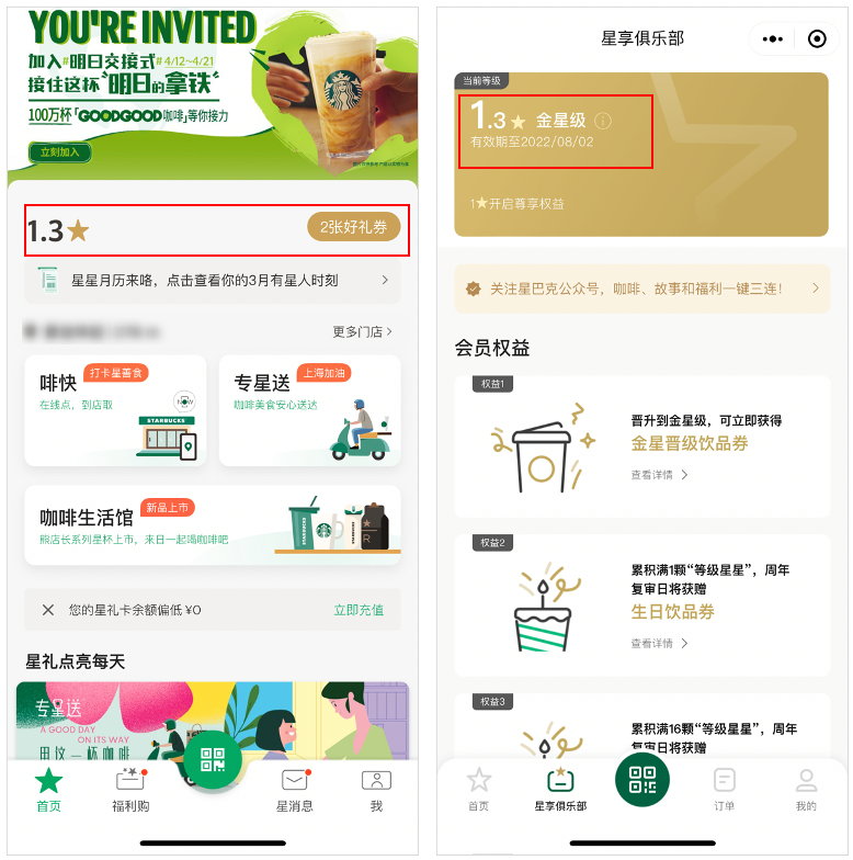 左:星巴克小程序;右:星巴克 App