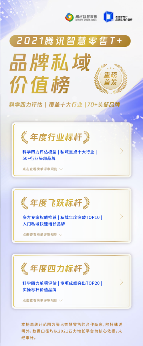 騰訊智慧零售通過4年多的實(shí)踐,發(fā)布了行業(yè)內(nèi)首個綜合衡量品牌私域經(jīng)營狀況的年度價值榜單——「T+品牌私域價值榜」。這份榜單共覆蓋 10 個垂直領(lǐng)域、70+ 個 領(lǐng)軍品牌,值得不同行業(yè)的私域從業(yè)者參考借鑒。