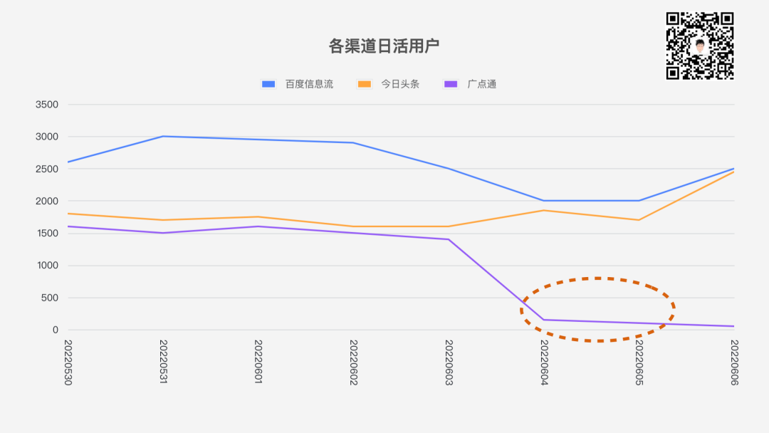 上一步單看一個數據指標,難以分析具體的情況并發(fā)現問題。所以,第三步,要看異常的數據指標,由哪些數據構成,將其逐層拆解,對比跟往常數據不一樣的地方。所謂維度,是指看數據的角度。常見的維度有:渠道、版本、地區(qū)、用戶類型、性別、年齡等。上述例子,我們確認了日活數據異常,而用戶有多個渠道來源,日活躍用戶也有老用戶和新用戶。我們先把幾個渠道數據拿來對比,發(fā)現廣點通渠道的數據,在周末大幅度下跌。