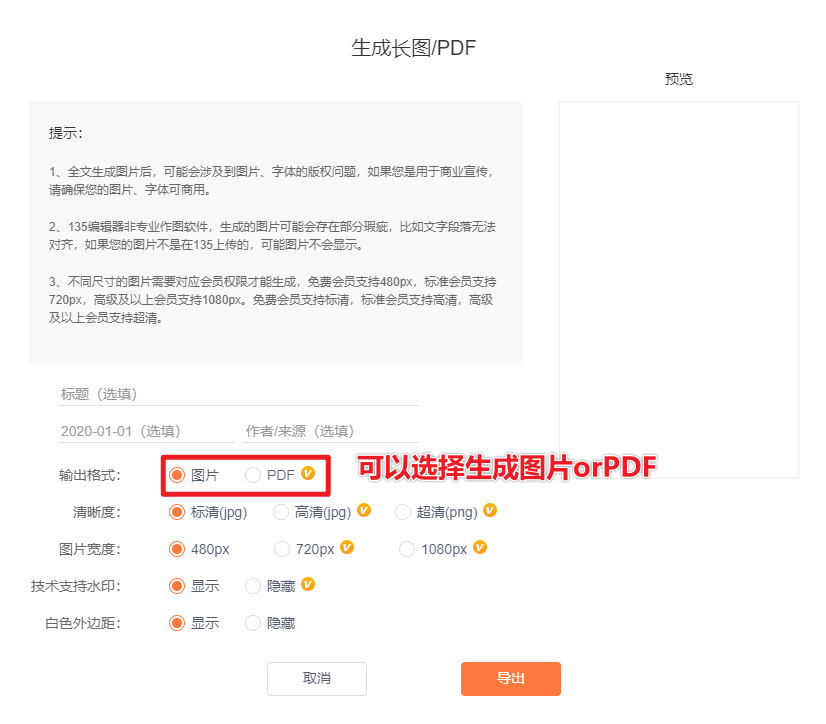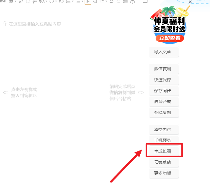 在編輯區(qū)域左側(cè)菜單欄中有【生成長(zhǎng)圖】,點(diǎn)擊之后可選擇生成圖片orPDF。