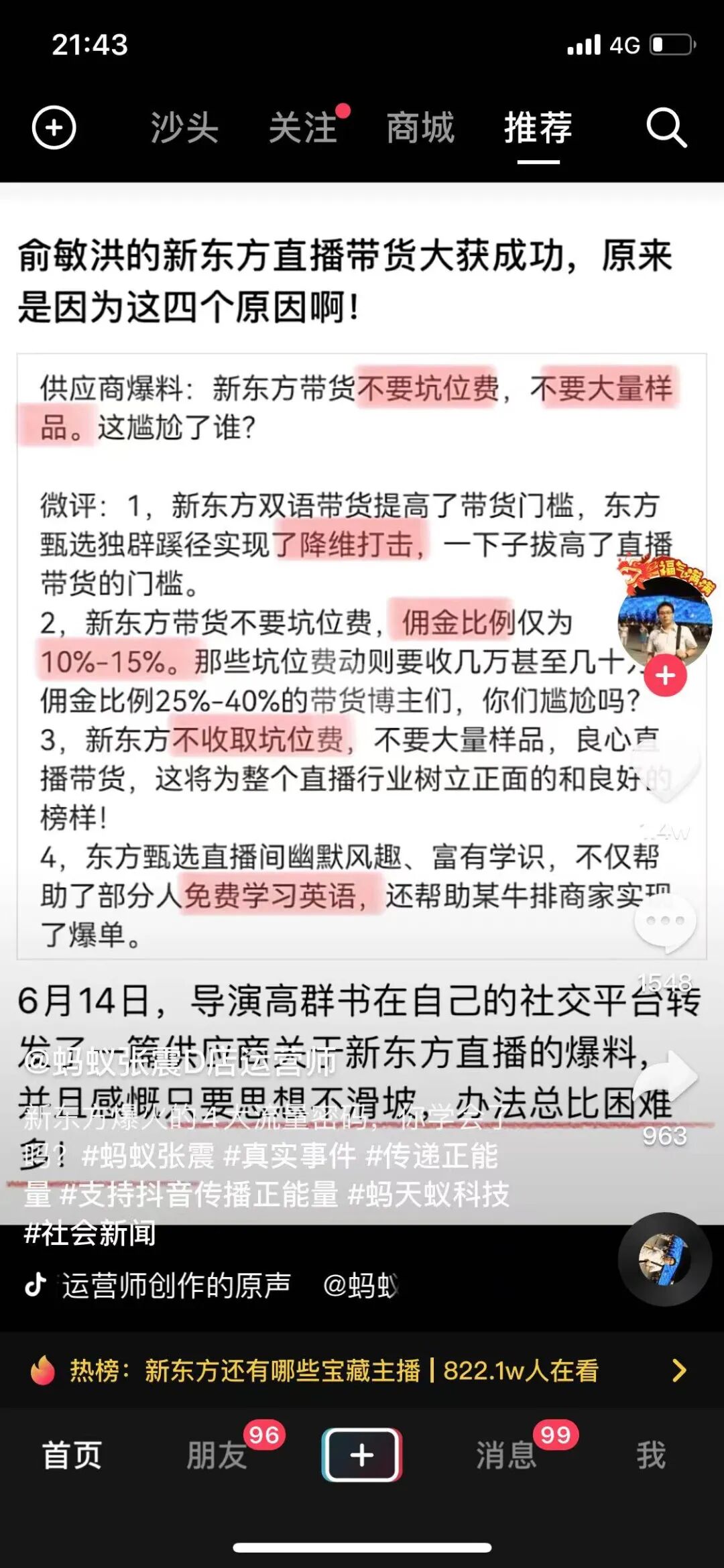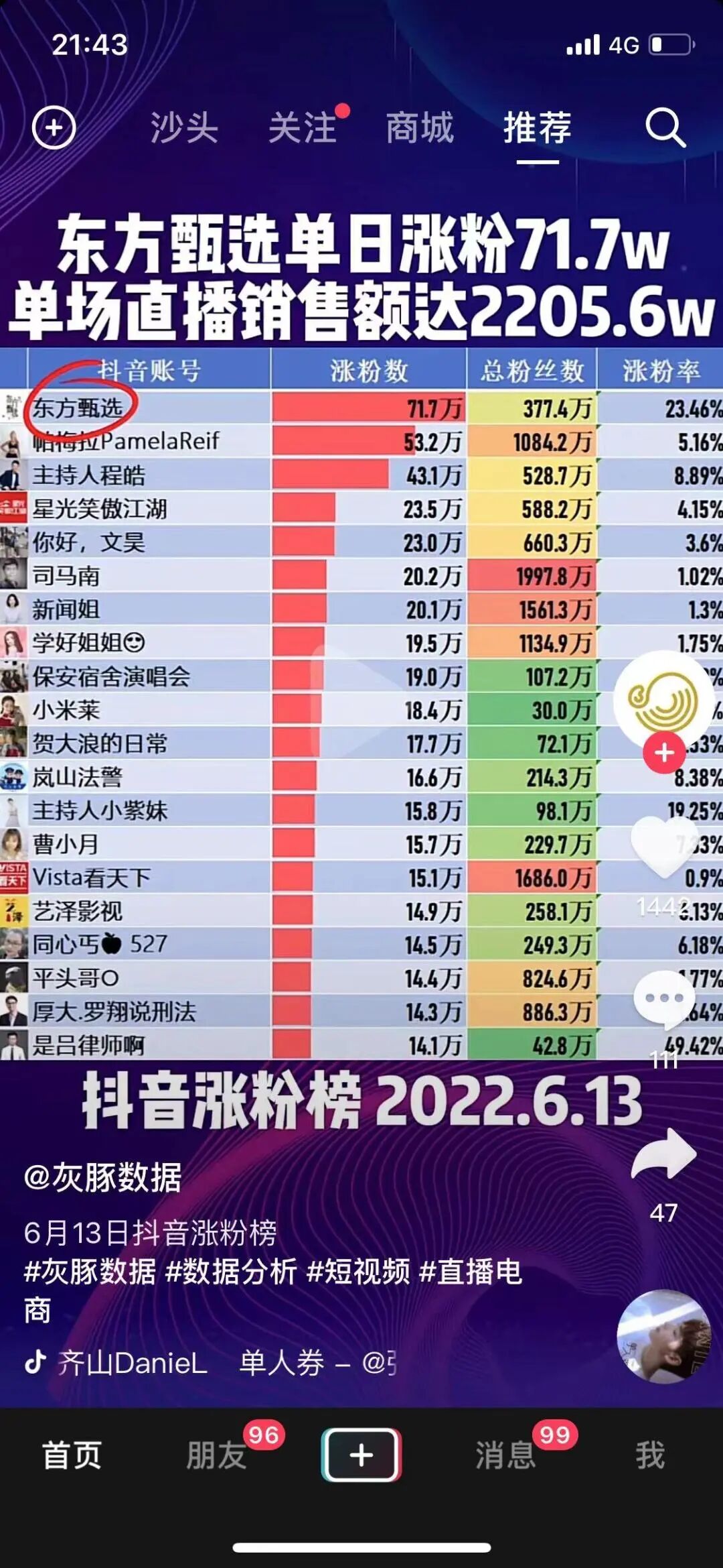 “抖音電商一哥”就此落幕,但抖音電商迫切需要“新一哥”。不知道你這幾天打開抖音,是不是刷到很多東方甄選的直播和短視頻啊,大叔有2個抖音號,我親測過,真的很多,就連某號吐槽抖音,“不要老給他推新東方直播間”的短視頻,都在2個抖音號刷到了。