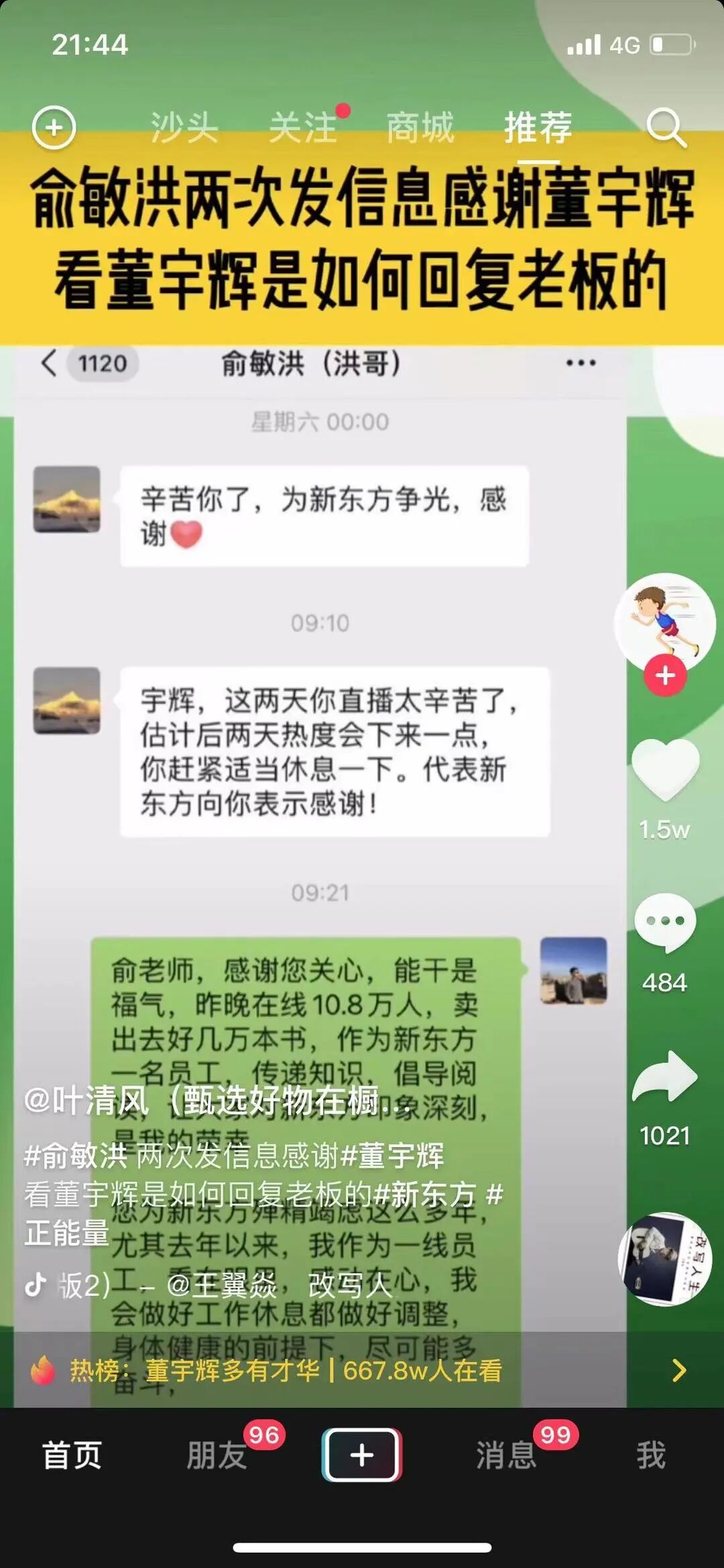 董老師借助媒體傳播,又不停滴給“新東方直播間”制造新聞話題,就連俞敏洪給董宇輝發(fā)微信感謝都能上熱搜,還加了一句:董宇輝的回復太機智了……