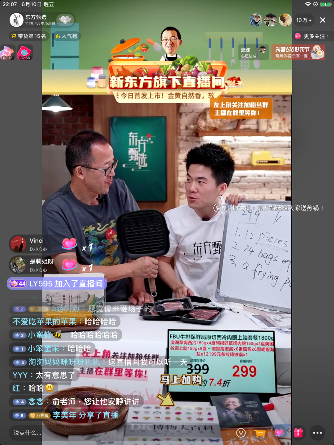 10號晚上我跟一幫朋友聚會結(jié)束,已經(jīng)快十點鐘,團隊讓我過去現(xiàn)場參與一下,我就過去了,參加了差不多一個小時的直播,和董宇輝一起調(diào)侃,結(jié)果同期在線人數(shù)超過了十萬人。這是我開播以來,包括我的個人號,從來沒有達到的數(shù)量。到我今天(16號)寫這篇文字的時候,昨天晚上董宇輝的直播,達到了同期在線六十萬人以上,這就是真正成為現(xiàn)象級的傳播了。當然這也可能是一時的熱鬧,但我確實希望東方甄選能夠從此打開局面,為新東方的發(fā)展,開辟一條全新的道路。