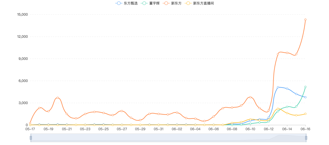 這幾天最熱話題,無疑是“新東方直播間”和“董宇輝”了。來自壹沓科技數(shù)據(jù)智能產(chǎn)品的數(shù)據(jù)顯示,從6月1日至16日,短短兩周,“新東方”上了8個平臺的117個熱搜。