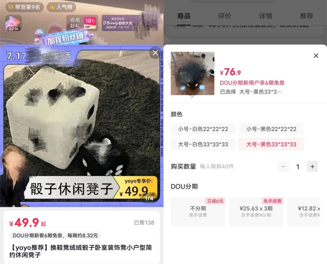 例如一款長得像骰子的凳子,10分鐘賣了138單,銷售額在6886元-10612元。