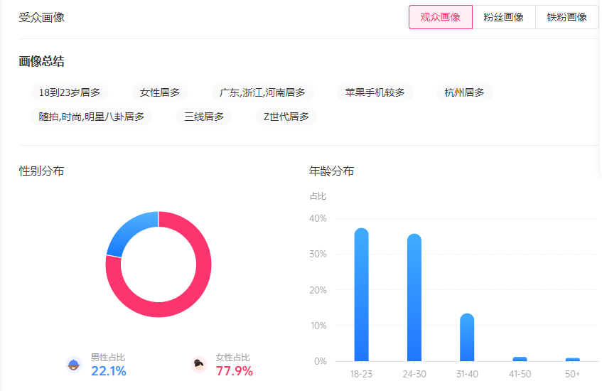 @yoyo的抖音粉絲畫像顯示,女性粉絲占比高達77.9%,這點剛好和其他顏值女網紅相反(男粉絲更多)。其中18-30歲女性占了絕大多數,這恰好是女裝的購買主力軍。