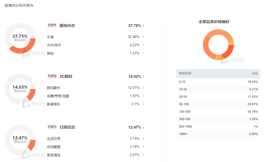數據顯示,她直播時,大家更想買的還是服裝,價格主要在50元-300元之間。這次并不是服裝專場,下次服裝專場的銷售額顯然會更加高。