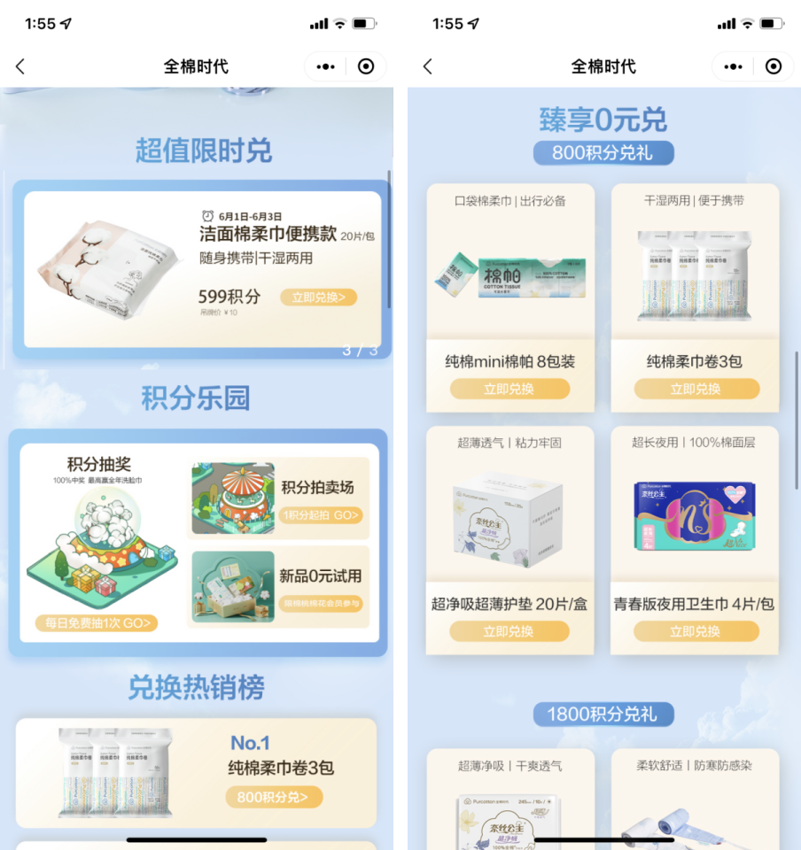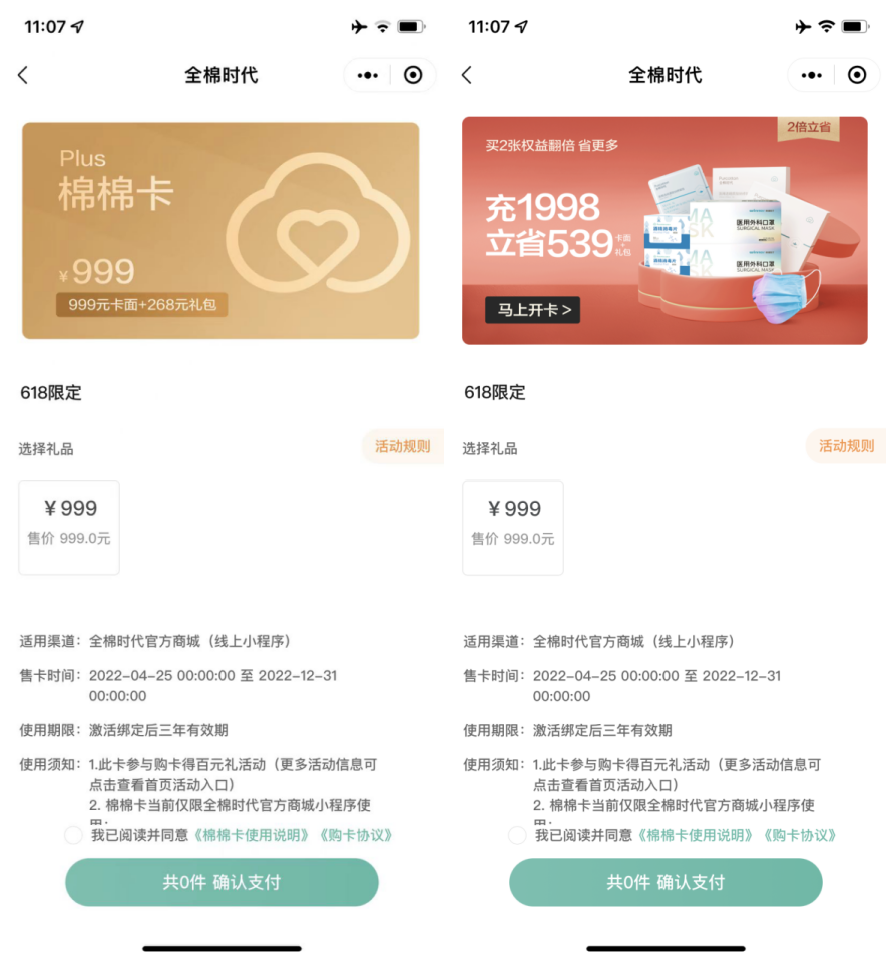儲值卡:目前全棉時代推出2種「綿綿卡」。充值999元贈送268元的禮包;充值1998元贈送539元的禮包,禮包內(nèi)容包括口罩、酒精棉片、醫(yī)用修復(fù)膜等。