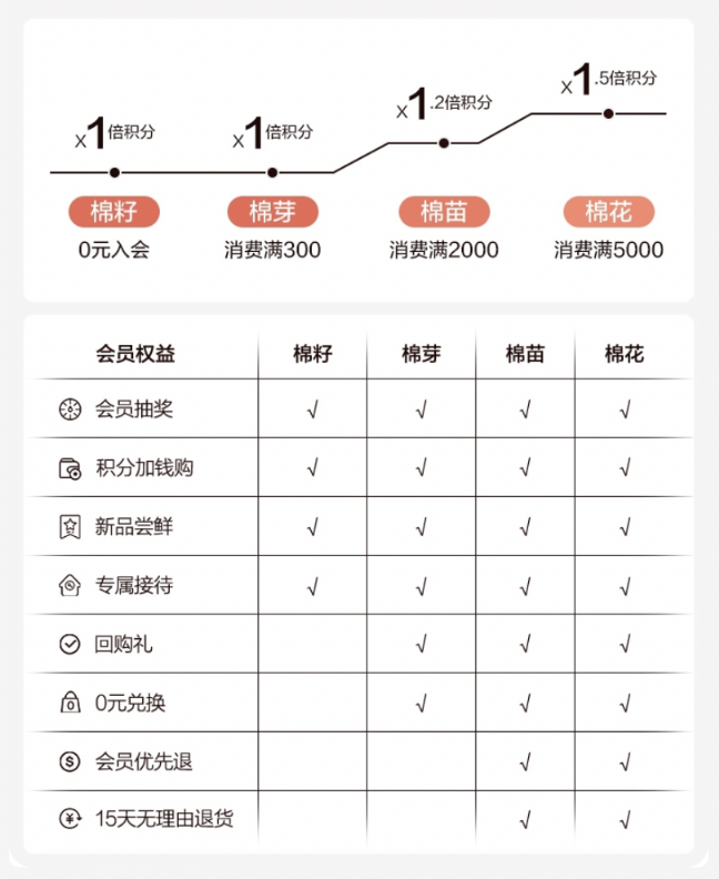 v2棉桃(消費滿500元):消費積分1元=1.5積分,首單復(fù)購禮,生日禮,折后92折
