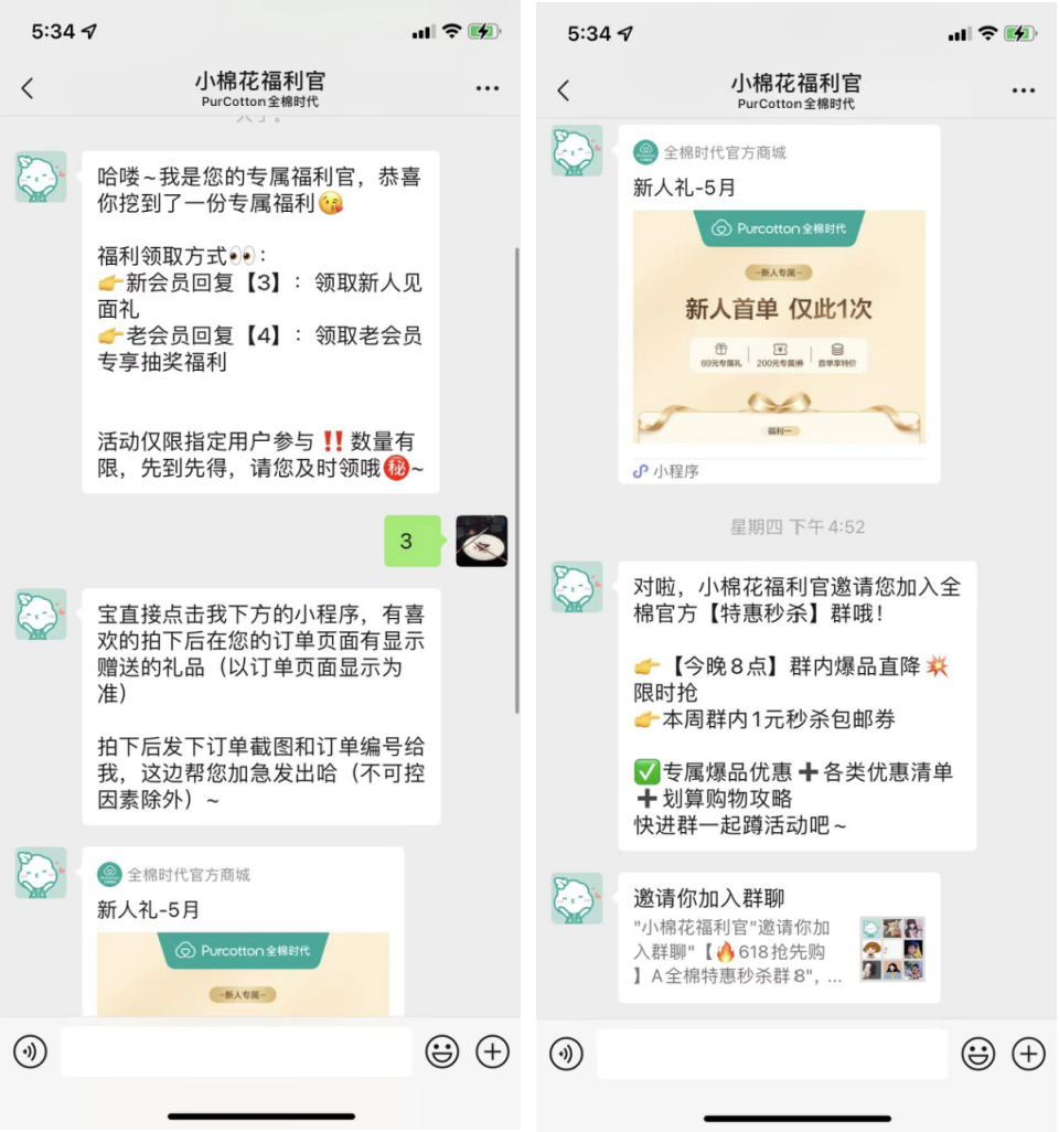 添加福利官微信后,會第一時間告知福利領(lǐng)取方式,新老用戶可選擇不同的福利。還會邀請用戶進入社群,并告知社群里包含的福利。