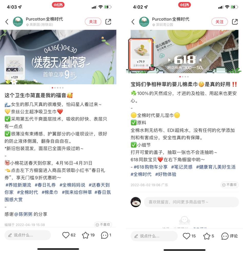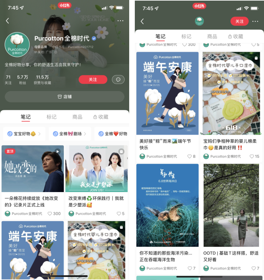 在產(chǎn)品種草的筆記里,全棉時代會在文末引導(dǎo)用戶進入櫥窗購買。