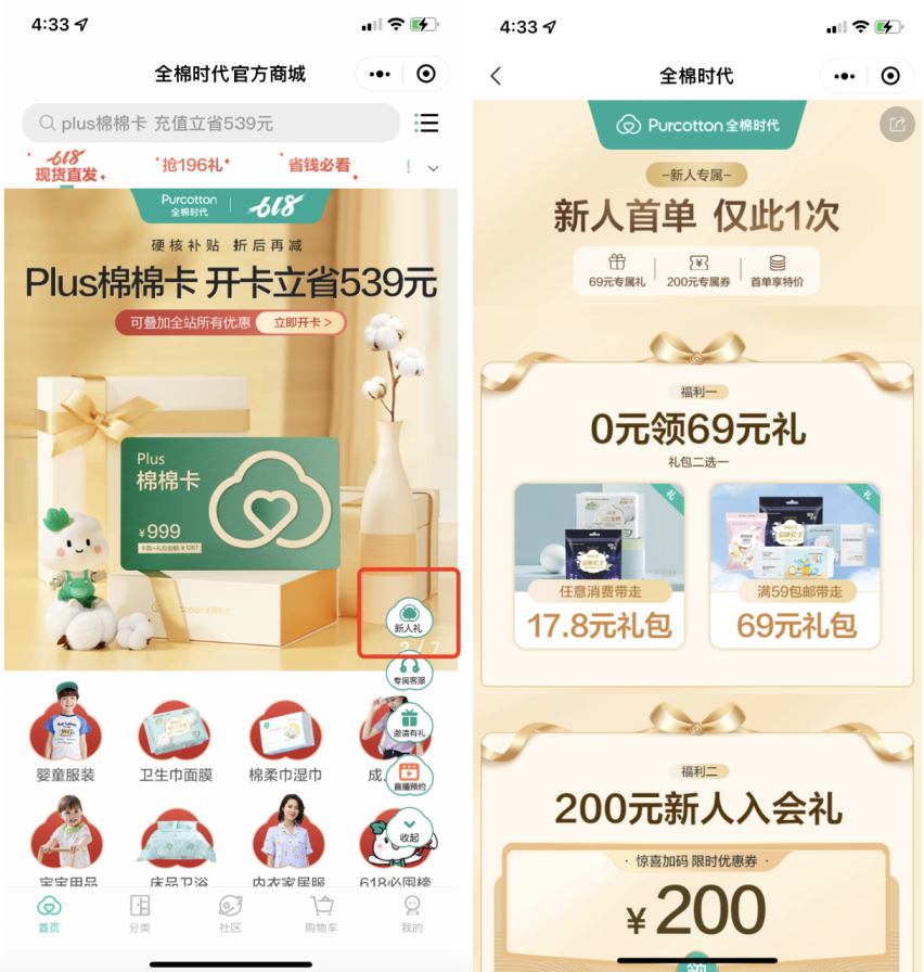 關(guān)注小程序的新客通常下單意愿較高,全棉時代在小程序的右下角設(shè)置了“新人禮”的窗口,新用戶可以領(lǐng)取對應(yīng)的禮包,從而留存住新用戶。