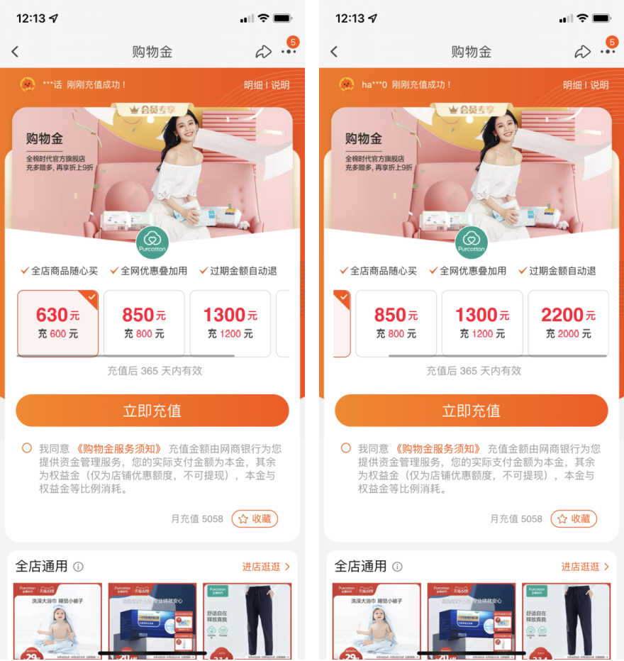 儲值卡:淘寶內(nèi)可以充值購物金,充值600得630,充值2000得2200,總共有4種選擇。從金額來說,力度并不大,但對全棉時代的鐵粉用戶來說,還是可以能省則省的。