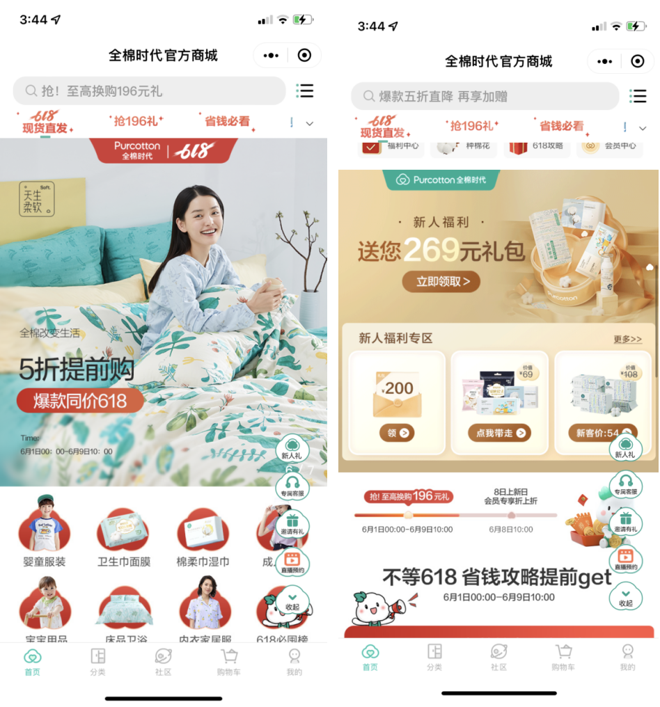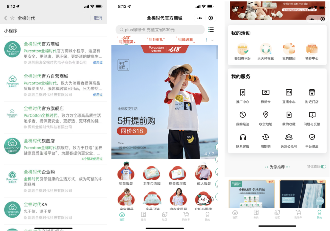 小程序:全棉時代旗下有眾多小程序,主要承擔(dān)著商城的功能,此外還會對線上私域和線下門店進行導(dǎo)流。