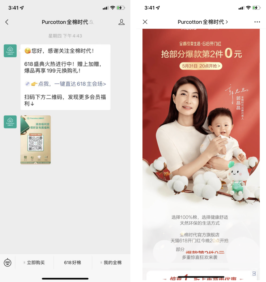 在關(guān)注全棉時代的公眾號后,會第一時間發(fā)送小程序商城鏈接,引導(dǎo)用戶進入購買。此外推文大部分內(nèi)容都與種草、活動相關(guān),會進行大量的引導(dǎo)下單。