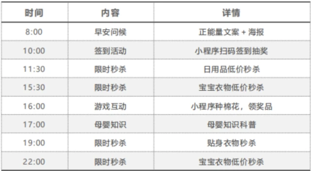 社群日常運營主要包括發(fā)送游戲互動、產(chǎn)品種草、限時秒殺等。通常都會有固定的安排,每周一至周末都會設(shè)置不同的活動,例如:
