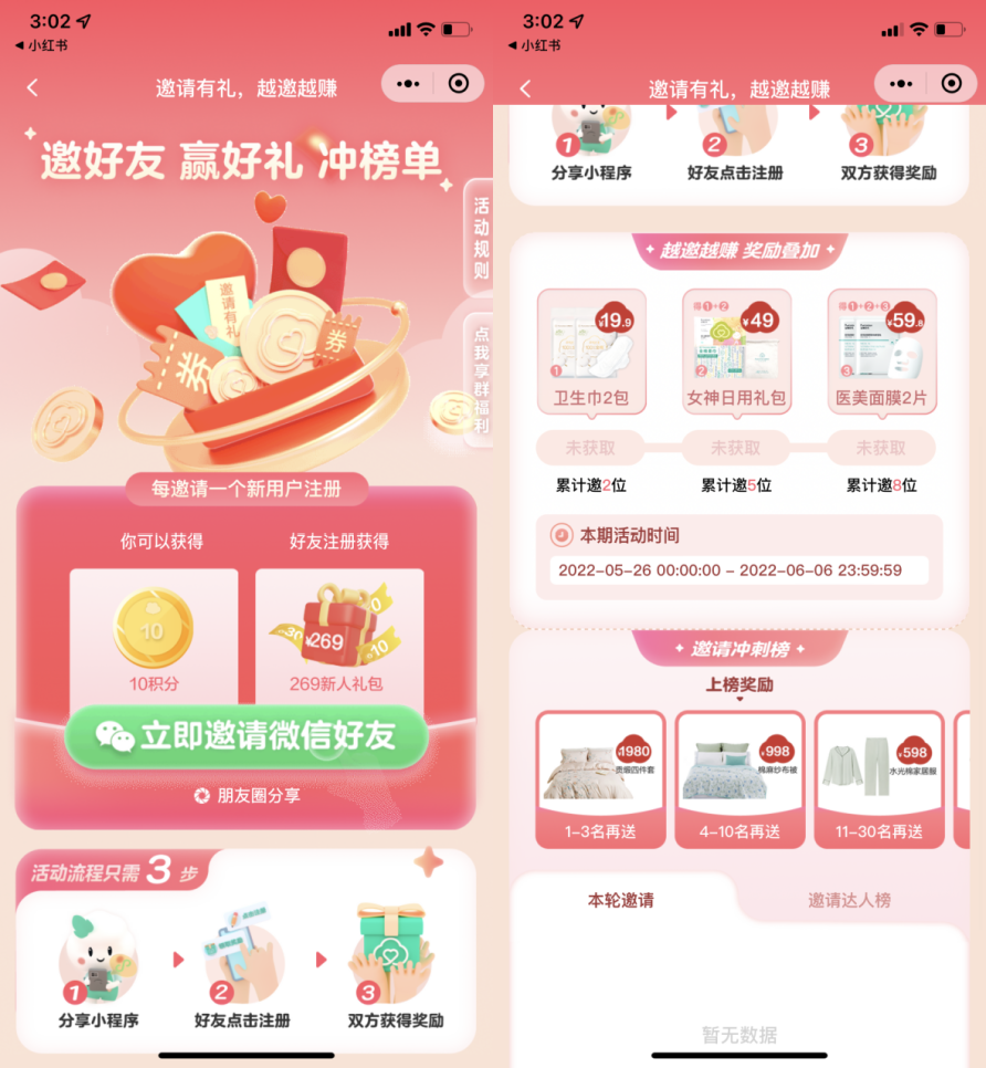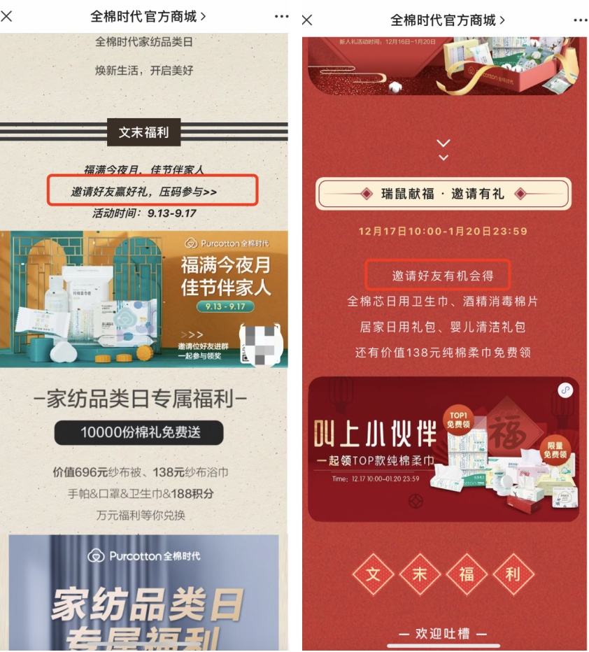 在擁有龐大私域流量的基礎(chǔ)之下,全棉時代會進行一些簡單的裂變玩法,合理利用私域資源,實現(xiàn)拉新復(fù)購的效果。以公眾號、小程序和微博三個渠道為例。