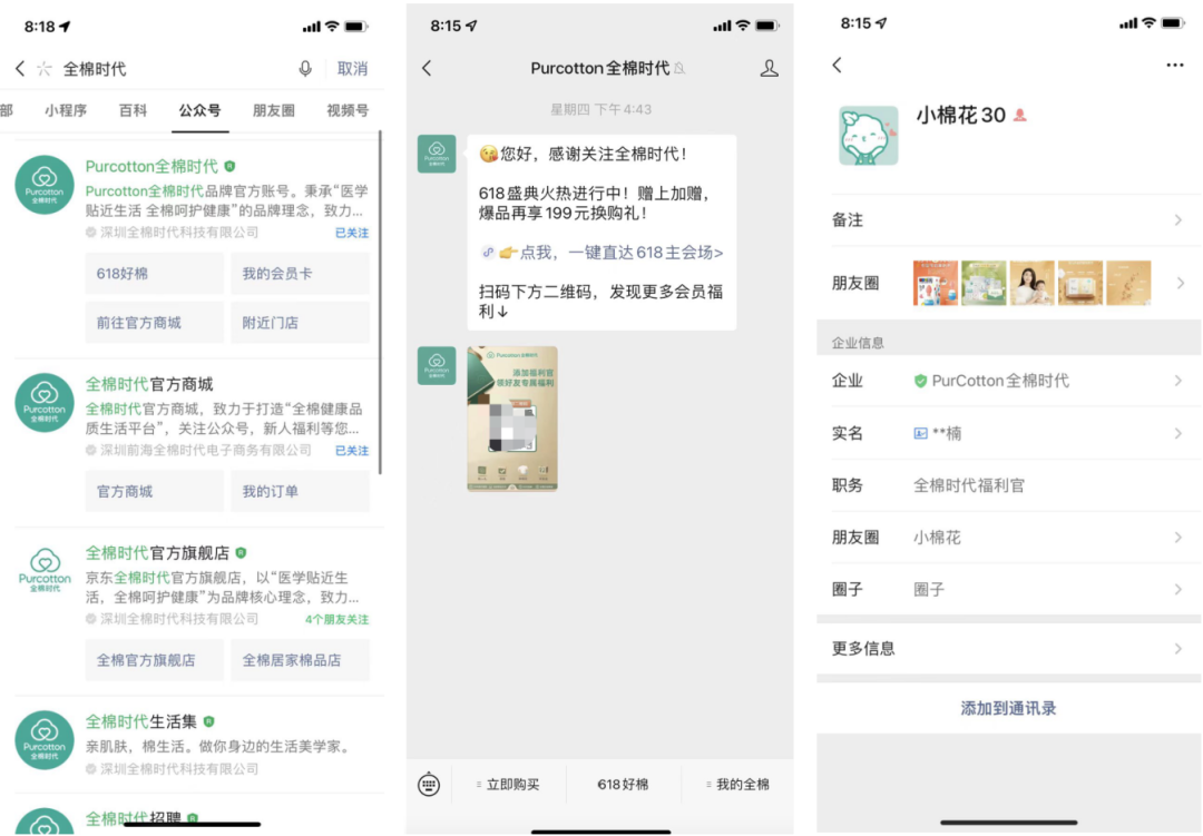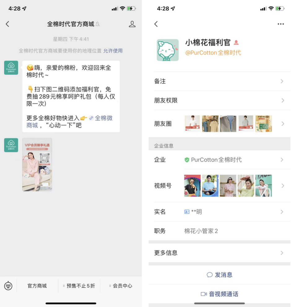 全棉時代圍繞品牌和產(chǎn)品特性,打造了統(tǒng)一的企業(yè)微信客服形象,讓用戶在添加到客服微信后,能感受專業(yè)統(tǒng)一的形象。