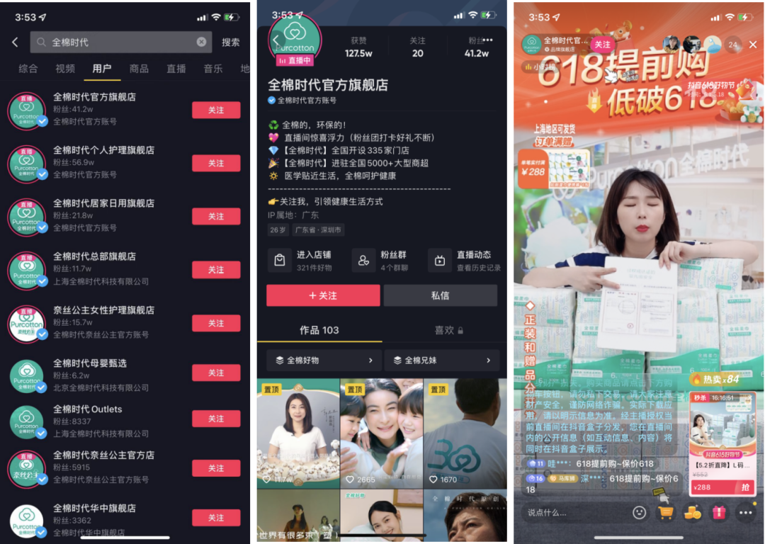 抖音:全棉時代在抖音建立了龐大的賬號矩陣,幾個主要賬號的粉絲總和超過150萬。主要視頻內(nèi)容包括品牌宣傳、產(chǎn)品種草、活動介紹。幾個主要賬號每日都會開啟直播,以帶貨為主。