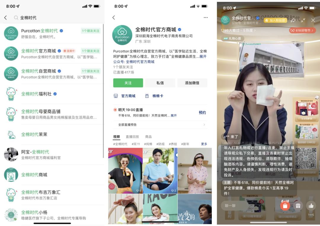 視頻號:全棉時代官方有4個視頻號賬號,主要內(nèi)容包括品牌宣傳、產(chǎn)品種草等。