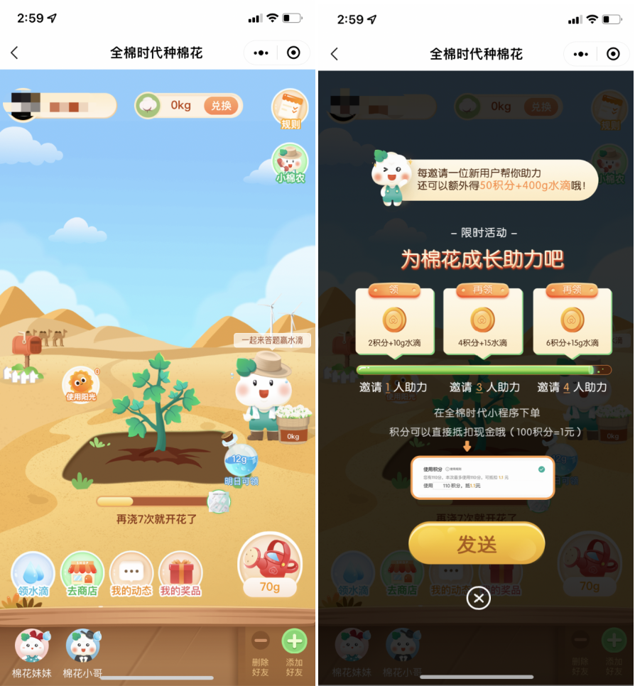 此外全棉時代的「種棉花」小游戲在社群內(nèi)是個不錯的互動玩法,用戶相互之間互助可以獲得游戲道具。