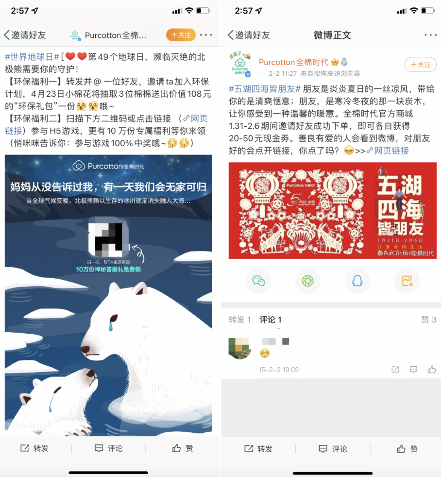 微博上主要通過福利抽獎,引導(dǎo)用戶轉(zhuǎn)發(fā)@好友進行分享,或是引導(dǎo)用戶在商城內(nèi)下單進行分享裂變。