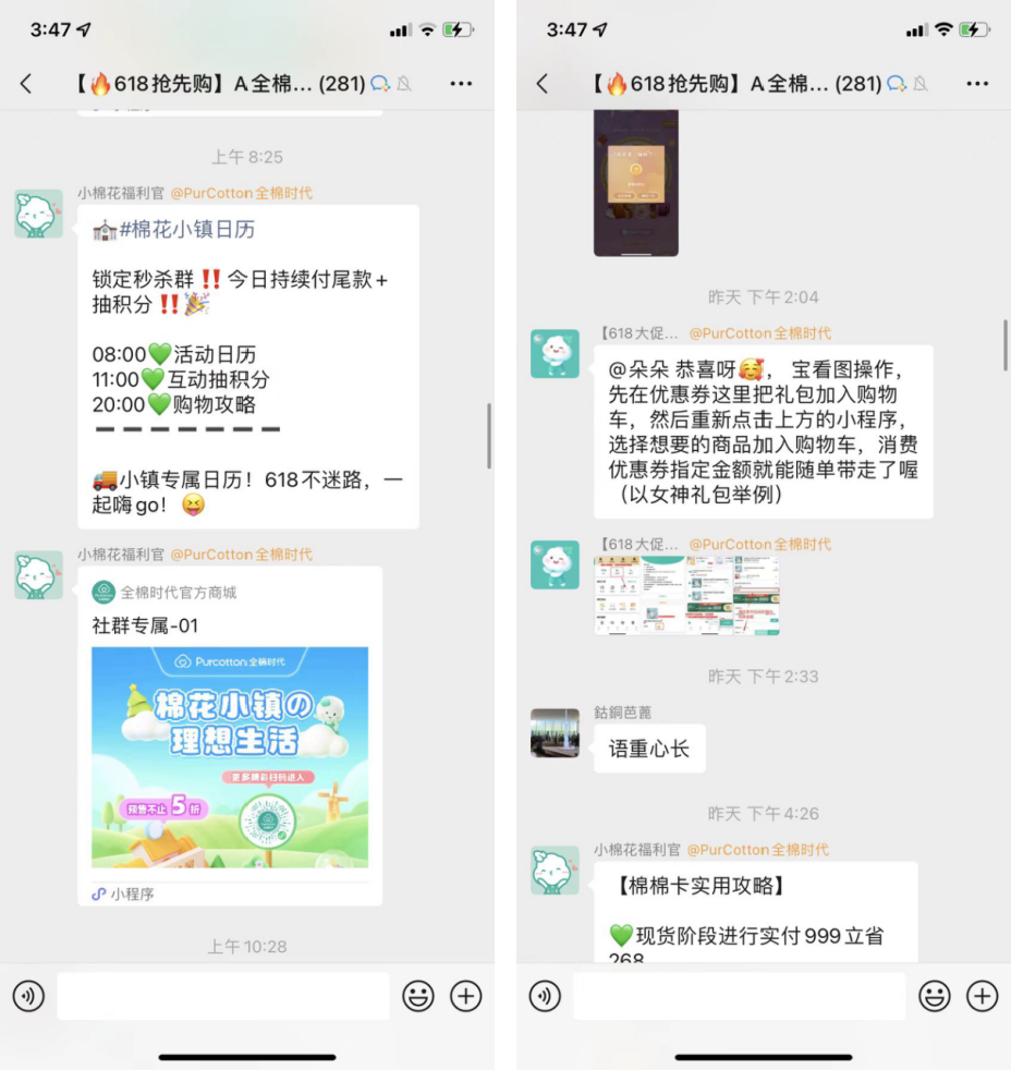 社群作為私域中促活最有效也是最常見的場景,下面對全棉時代的社群進行拆解,以我添加的某個社群為例。